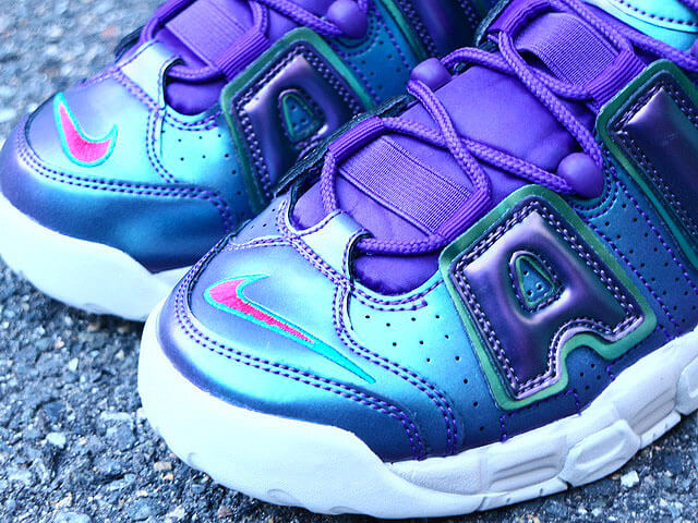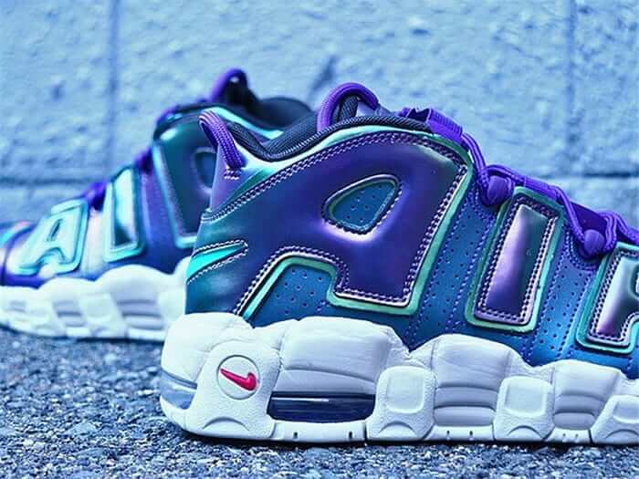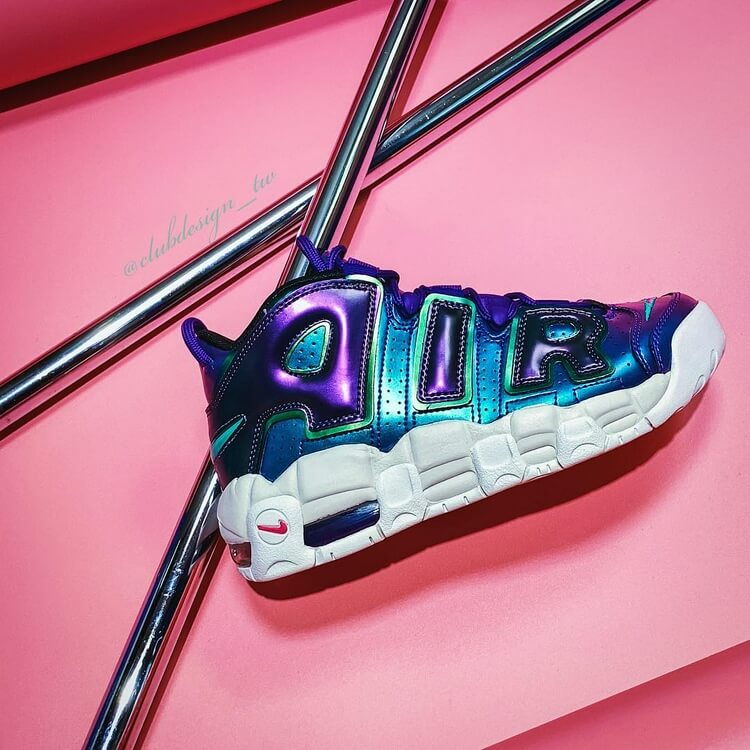 Air More Uptempo 的新配色也不断的被开发,这次全新的 Air More Uptempo GS 电光基佬紫在海外发售,鞋面以紫色为基调,并加入多彩变光设计。
