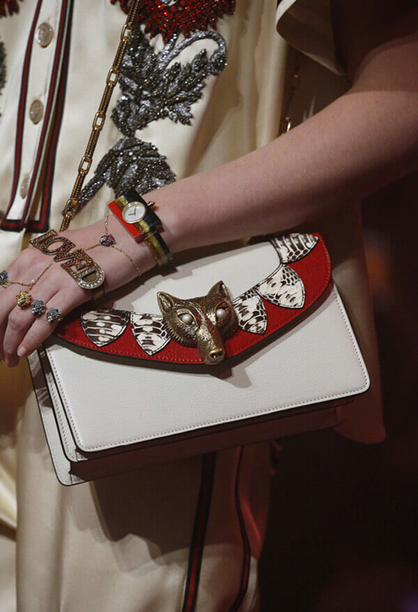 Gucci这些年是越来越美了,将经典红绿配色赋予新生命的同时又运用各种神话传说的动物图腾打造出繁复灵动的设计,赋予了商品金钱价值外更多的文化价值。