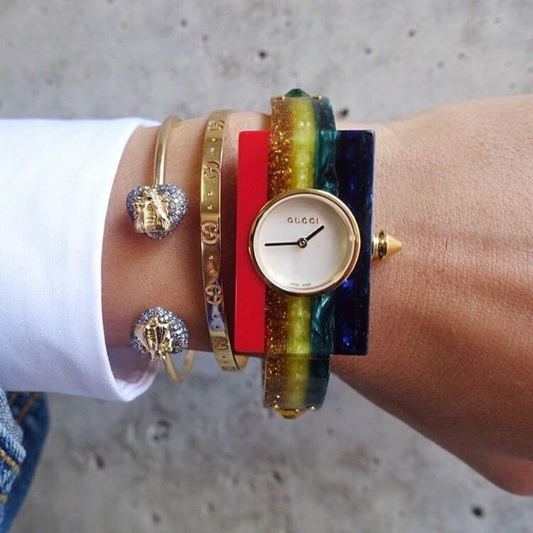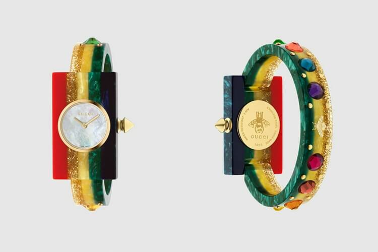 小巧的白色珍珠母贝表盘配上这样复古艳丽的颜色更显精致,表带处同样为有机玻璃,在外侧镶嵌彩色水晶铆钉和金色蜜蜂雕花,每一处细节都体现着Gucci珍奢复古的风格,让人无法不爱😍!