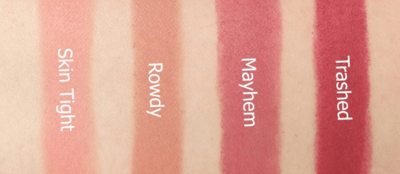 唇膏笔色号分别是: • SKIN TIGHT 限量浅珊瑚 • ROWDY 限量粉棕色 • MAYHEM 限量冷豆沙 • TRASHED 限量暖莓果