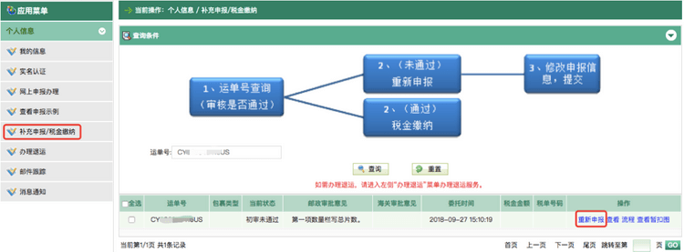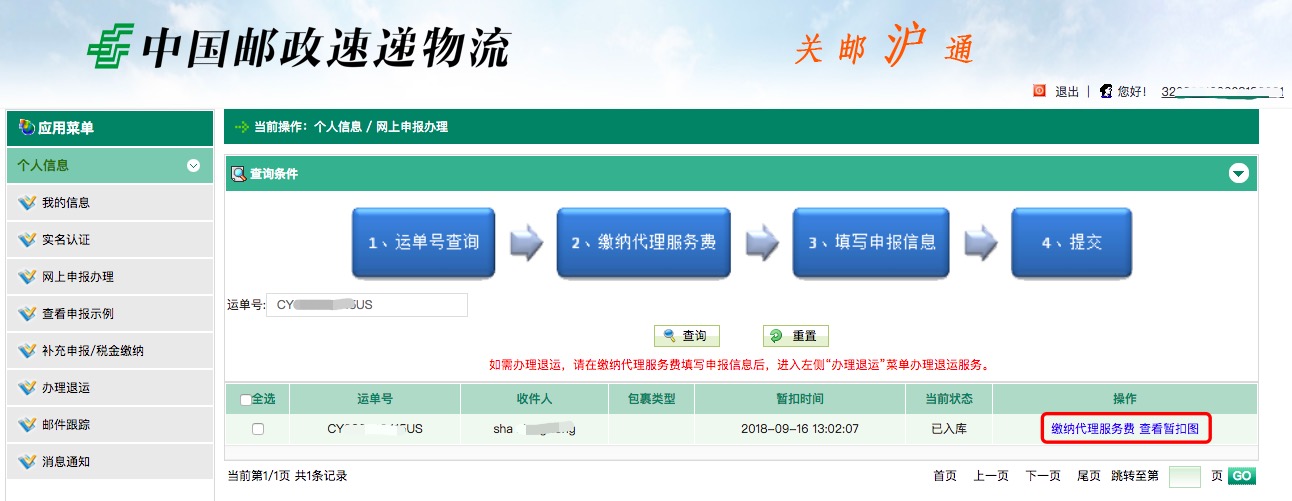 >>点击【网上申报办理】,输入需申报的邮政物流单号,点击【查询】后,将会看到需申报的包裹信息。>>接着,点击【缴纳代理服务费】来选择支付方式完成付款。您也可点击【查看暂扣图】看到需申报包裹的照片哦。