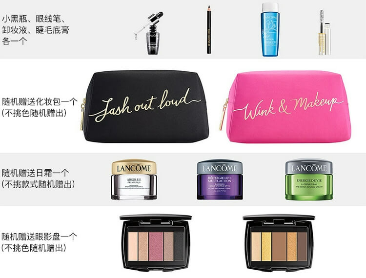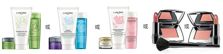 购买兰蔻商品满$70美金以上,再随机加送3件套礼包,以下是有可能获得的选项:【选项1】水光润三件套(洗面/眼霜/爽肤水中样)【选项2】清爽拉提三件套(洗面/眼霜/蓝水中样)【选项3】舒缓修护三件套(洗面/眼霜/粉水中样)【选项4】彩妆三件套(随机色唇膏/腮红/腮红刷)
