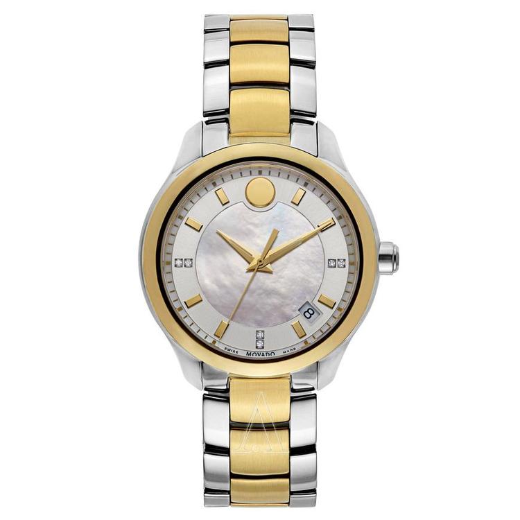 白银珍珠贝母表盘,优雅精致。搭配金色条形刻度和钻石时标,带有摩凡陀象征性的圆点标志。银金色搭配的不锈钢表链,凸显强大的气场。