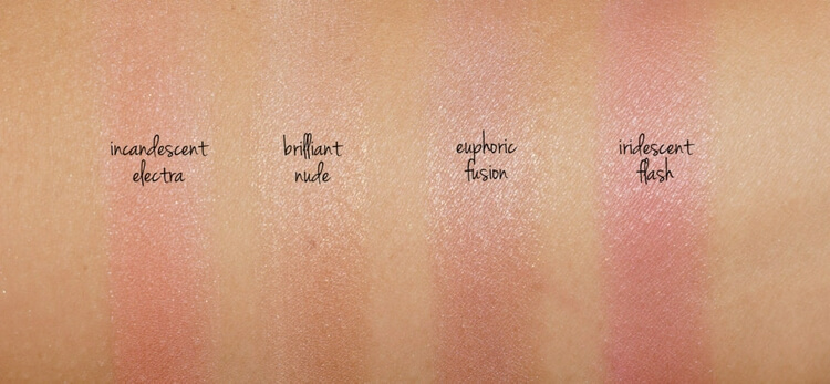 色号方面:# Incandescent Electra,冷调蜜桃红色,显白又元气# Brilliant Nude,深琥珀色,很“素颜”的一块,浅白皮可以用来修容# Euphoric Fusion,浅紫色,吼显白# Iridescent Flash,明亮洋红色,十分明媚,充满少女感手臂试色如下👇