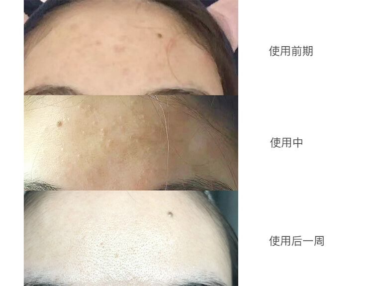 连续使用了三天,下巴和额头的痘痘已经全部消下去了,只剩下闭口和痘印了,后来断断续续使用了一个星期,闭口粉刺已经基本不见了,只留有浅浅的痘印和个别顽强的闭口。