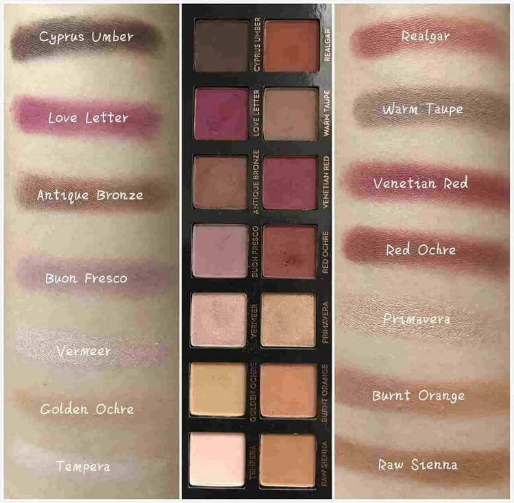 文艺复兴眼影盘的外包装是丝绒质地的紫灰色,手感略奇异,可是好舒服~里面包含14块眼影、一面镜子和一支双头眼影刷。一眼看去,最吸引人的就是超级适合亚洲妹的橘色系和红色系那几格,并且超级适合秋冬啊!哑光、珠光及丝光三种质感,在亮度方面完全不用纠结了,珠光的质地比较软糯,哑光比较顺滑哦!这盘显色度也超棒,粉质也好细,比起其他盘子,🐯相信我会宠爱它很久的,然后这盘很有可能成为我第一盒眼影空盘......