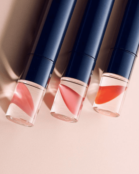 笔尾的色号设计更加绝妙精致了:像是彩色的液体,随着流水般的柔软、飘荡,然后凝结于空气之中;又像是一枚娇柔的花瓣嵌于澄净的琥珀中,有种日式娴静的美感。