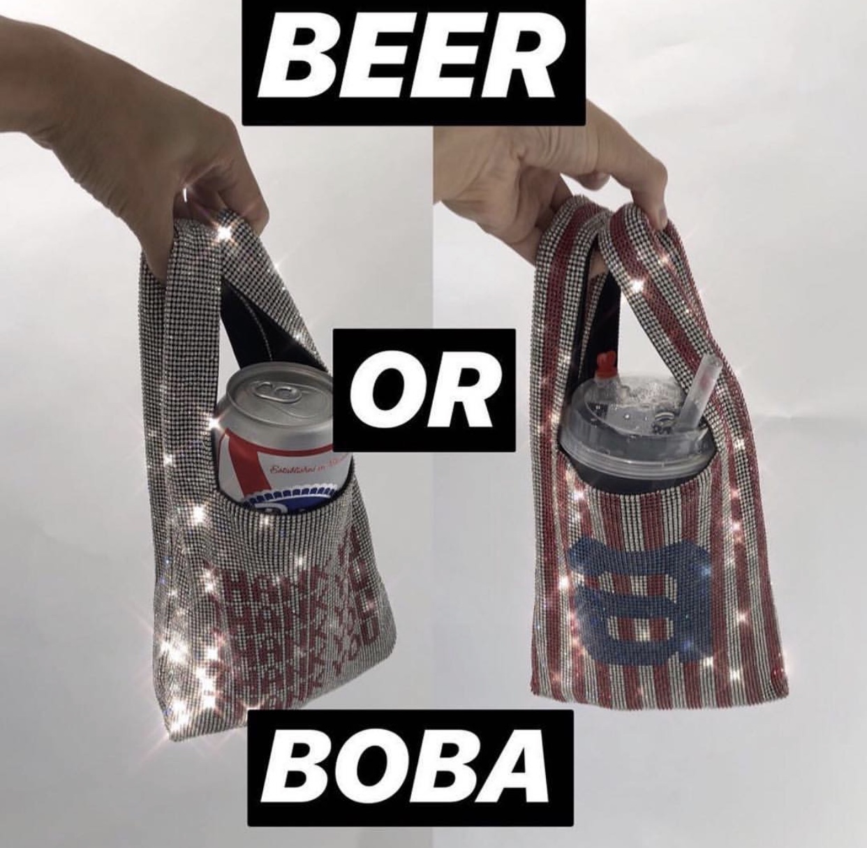 迷你购物袋的包型,非常别致,小羊皮材质上面附着闪钻,整体就是blingbling满满少女心。
