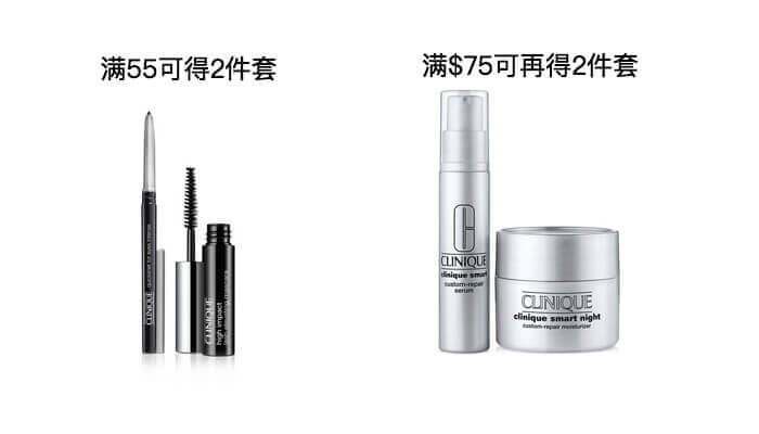 ▶购倩碧满$55可得眼妆2件套: • 迷你纤长卷翘睫毛膏豪华中样1个 • 迷你精细眼线笔1个▶购倩碧满$75可得智慧锁定系列两件套: • 修护精华素豪华中样 • 修护保湿晚霜豪华中样