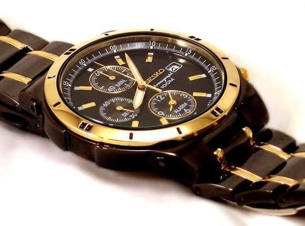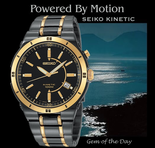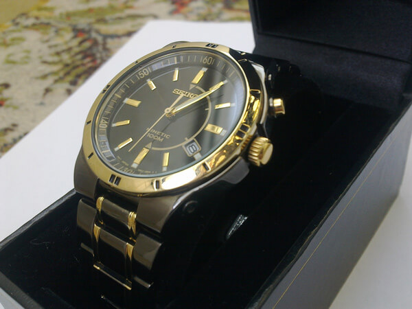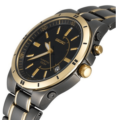 这款精工人动能男款腕表亮点就是运用精工首创的人动电能技术,采用精工Kinetic人动电能技术机芯5M62,摆摆手就可以给电池充电,充满电后运行长达6个月;黑色不锈钢材质表壳及表带,表面添加碳化钛镀层,坚固耐磨,抗腐蚀性也比较不错,金色部位为镀黄金;4点钟方向日期显示,Hardlex防划水晶镜面,防水100米。