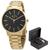 Gold-tone stainless steel case and bracelet. Fixed gold-tone bezel. Black dial with gold-tone hands and index hour markers. Dial Type: Analog. Quartz movement. Scratch resistant mineral crystal. Pull / push crown. Solid case back. Round case shape. Case size: 42 mm. Case thickness: 8 mm. Band width: 20 mm. Fold over clasp with a push button release. Water resistant at 50 meters / 165 feet. Functions: hour, minute, second. Cayde Series. Casual watch style. Armani Exchange Cayde Quartz Black Dial Mens Watch AX7119.