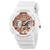 White resin case and strap. Fixed white resin bezel. Rose gold dial with rose gold-tone hands and index hour markers. Dial Type: Analog-digital. Full auto-calendar. Casio Calibre 5518 quartz movement. Scratch resistant mineral crystal. Solid case back. Round case shape, case size: 49 mm x 45.9 mm. Tang clasp. Water resistant at 200 meters / 660 feet. Functions: date, day, hour, minute, second, world time, 1/1000-second stopwatch, countdown timer, 5 daily alarms, 12/24-hour format. G-shock S Series Series. Sport watch style. Casio G-Shock S Series Rose Gold Dial Ladies Sports Watch GMAS120MF-7A2.