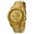 Yellow gold-tone stainless steel case and bracelet. Unidirectional yellow gold-tone bezel. Champagne dial with luminous hands and alternating Arabic numeral and index hour markers. Minute markers around the outer rim. Date display appears at the 6 oclock position. Chronograph - three sub-dials displaying: 24 hours, 60 minutes and 60 seconds. Quartz movement. Scratch resistant flame fusion crystal. Solid case back. Case diameter: 50 mm. Case thickness: 13 mm. Bracelet width: 26 mm. Deployment clasp with safety release. Water resistant at 50 meters/ 165 feet. Functions: hours, minutes, seconds, chronograph, calendar. Invicta Elegant Ocean Champagne Dial Mens Watch 1270.