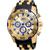 Gold-tone stainless steel case with a two-tone (black and silver-tone) black polyurethane with stainless steel accents strap. Uni-directional rotating stainless steel and aluminum bezel with a gold-tone count-up elapsed time top ring. Gold dial with luminous blue arrow-shaped hands and index hour markers. Minute markers around the outer rim. Dial Type: Analog. Luminescent hands and markers. Date display between 4 and 5 oclock position. Chronograph - three sub-dials displaying: 60 second, 30 minute and 1/10th of a second. Hattori Caliber VD53 quartz movement. Scratch resistant mineral crystal. Pull / push crown. Solid case back. Round case shape, case size: 50 mm. Band width: 26 mm. Tang clasp. Water resistant at 100 meters / 330 feet. Functions: chronograph, date, hour, minute, second. Pro Diver Series. Sport watch style. Watch label: Japan Movt. Invicta Pro Diver Chronograph Quartz Gold Dial Mens Watch 22308.