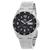 Silver-tone stainless steel case and bracelet. Uni-directional rotating black stainless steel bezel. Black dial with silver-tone hands and index-Arabic numeral hour markers. Minute markers around the outer rim. Dial Type: Analog. Luminescent hands and markers. Day of the week and date display at the 3 oclock position. Orient Calibre F6922 Automatic movement, containing 22 Jewels, bitting at 21600 vph, and has a power reserve of approximately 40 hours. Screw down crown. Solid case back. Round case shape, case size: 41.5 mm. Fold over clasp with a safety release. Water resistant at 200 meters / 660 feet. Functions: date, day, hour, minute, second. Mako II Series. Watch label: Japan Movt. Orient Mako II Automatic Black Dial Watch TAA02001B.