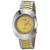 Stainless steel case with a two-tone (silver and gold PVD) stainless steel bracelet. Fixed silver-tone stainless steel bezel. Gold dial with silver-tone hands and index hour markers. Minute markers around the outer rim. Dial Type: Analog. Day of the week and date display at the 3 oclock position. Quartz movement. Scratch resistant sapphire crystal. Screw down crown. Solid case back. Round case shape. Case size: 35 mm. Case thickness: 8.4 mm. Fold over clasp. Water resistant at 30 meters / 100 feet. Functions: date, day, hour, minute, second. Casual watch style. Watch label: Swiss Made. Rado The Original Quartz Gold Dial Mens Watch R12391633