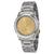 Stainless steel case with a stainless steel bracelet. Fixed stainless steel bezel. Gold dial with luminous gold-tone hands and index hour markers. Minute markers around the outer rim. Dial Type: Analog. Luminescent hands and markers. Date and day of the week display at the 3 oclock position. Automatic movement with a 40-hour power reserve. Scratch resistant Hardlex crystal. Push / pull crown. Skeleton case back. Case diameter: 38 mm. Case thickness: 12 mm. Band width: 19.5 mm. Deployment clasp with a push button release. Water resistant at 30 meters / 100 feet. Functions: date, day, hour, minute, second. Casual watch style. Seiko 5 Automatic Stainless Steel Gold Dial Mens Watch SNKK13