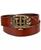Old English brass-tone monogram logo crest cutout plaque buckle; burnished and polished strap edges; seven holes included for an adjustable fit