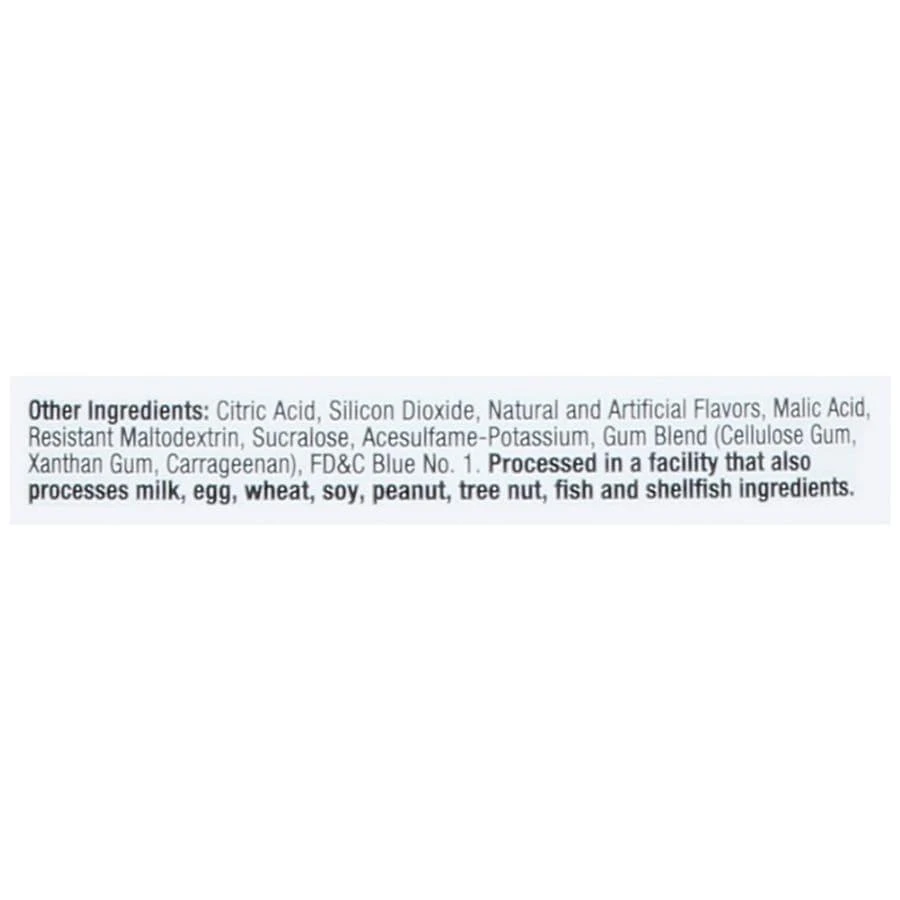 ingredients: Citric Acid,Silicon Dioxide,Natural and Artificial Flavors,Malic Acid,Resistant Maltodextrin,Sucralose,Acesulfame-Potassium,Gum Blend,Cellulose Gum,Xanthan Gum,Carrageenan,FD&C Blue 1