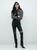 These are leather pants inspired by classic biker wear, reinterpreted in a sophisticated and chic style with glam accents exuding a calm aesthetic.